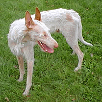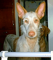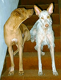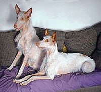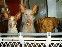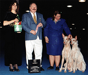 Here is Astro with his sister Phoenix winning BEST BRACE at the Ibizan Hound Club of the United States National Specialty on March 13, 2002. |