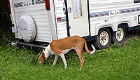 | Here Chaos is grazing on some grass by the camper. |