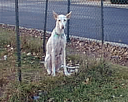 | Doesn't Frosty look sad sitting in the fenced part of the yard all by himself? Actually his housebrothers are with him, but not in the picture. |