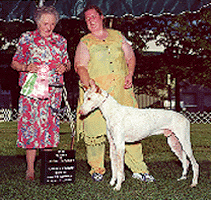 | Here is a picture from Frosty winning the veteran's class at the IHCUS national specialty held in Waukesha, WI on July 31, 1999. Judge was Dorothy Macdonald. |