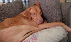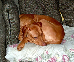 Kito's laying in his favorite spot here in the house. |