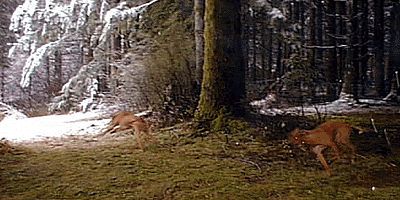 Kito & Mooman running in the snow at our new house. |