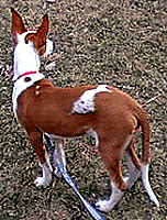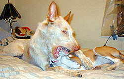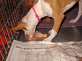 | Here is Madja eating her first chicken leg. She is fed B.A.R.F. (Bones And Raw Foods). |