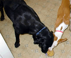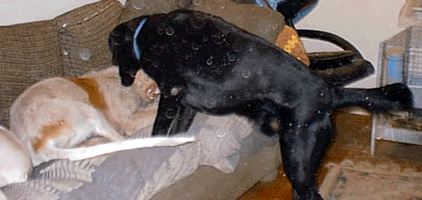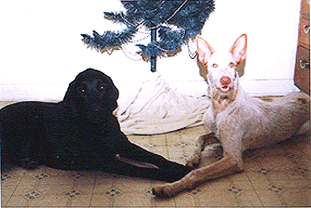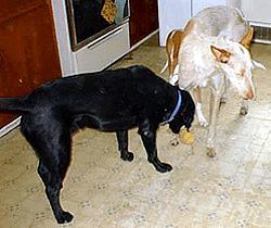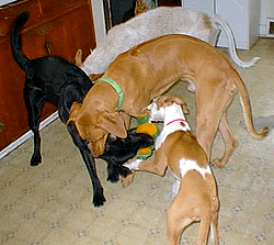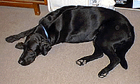 This is Cody. He is a 2 year old Black Labrador Retriever. Cody was born in August, 1997. Cody joined our pack on December 8, 1999- when his owner (my good friend) Alice Sorensen, had passed away. And on May 21, 2000- Cody found his new pernament home with a lab mixed whose name is Mya & her family, the Cochran's! Cody & his good friend, Astro are busy playing! Since this was the first Christmas for Astro and Cody with us, the boys decided to wait under the tree to see what happens next! Here is Cody resting in the bedroom after a hard day of playing with the puppies. Here is Cody & Madja fighting over the same stuffed duck. Here Astro came into the room to get that stuffed duck! Kito brought in the stuffed frog so now all 4 are trying to get the same toy!
