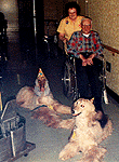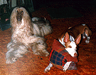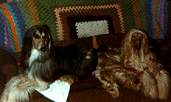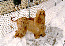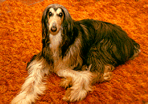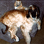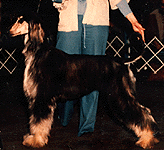 This was "Cupid", Celaine's Just In Love, CD, FCH, TT, TDI. He was born 6/27/82 & died on 3/26/93 of prostrate cancer. Cupid loved being a therapy dog at the VA hospital in Milwaukee, WI. Here he is pictured with his pal, Damion. Cupid & Dreamer looking cute for the camera. This was Cupid's & Marquis mom, "Cinder", King's Royal Celaine In Blue. Owner was Cheryl Brainard. This was Mark's dad, "Dahan", King's Royal Dahan Damari, FCH. Owner was Cheryl Brainard. This was "Mark" His full name was Celaine's Royal Marquis. He was born on 2/17/83 & died peacefully the night of 1/18/96. Mark & Cupid doing what Afghans do best, look beautiful. This was Tim'e. His full name was Chandar's Manhattan Time. Tim'e was born on 7/31/84 & died on 9/1/90. Tim'e was an condo-gan. He height was 24 inches at the shoulders. The perfect size for condominium living. Tim'e loved to play with a ball. Here he was eyeing up the toy. This was "Ahka". His full name was Ahka Poco Gold. He was born on 6/26/79 & died on 4/10/83. Here Ahka was sharing his chair with Cupid. This was Pepe. His full name was Pepe Le' Poo. He was born 2/2/1972 & died in 1984.