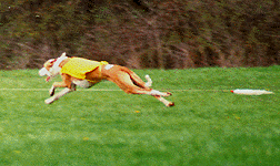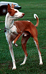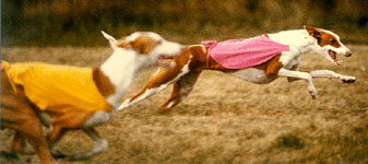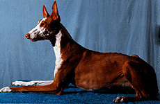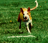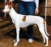 This was Dreamer's mom, "Isis. Ch. Black-Chips Isis of Atair, LCM. She was owned by Mary Ann Blair. This was Dreamer's dad, "Atair". Am/Can Ch. O'Bre-On's Eternal Fiver Atair, Am/Can CD, LCM, Can FCH, TT. He was owned by Chris Allen. This was "Dreamer". U-CD, BIF, CH. Atair's DeJa'Vue He's A Dream, CD, LCM-2, SC, TT, TDI, CGC. (AKA- Beast, Deemin) He was born on 3/10/85. Dreamer was the first most variety titled Ibizan Hound in the USA. His favorite activities were lure coursing & obedience (before a neck injury), and being a couch potato. Dreamer was always rated in the top 5 for lure coursing & obedience. Dreamer ready to make the kill on the bunny! Oops! Who's chasing who? Actually Dreamer is running between the 2 bunnies tied to the line. Dreamer (in blue) & Commander out chasing the bunny! Dreamer (in yellow) & Scarlet (Chaos' Mom) chasing the bunny! Dreamer, Commander & Frosty sitting pretty for the camera. Cupid & Dreamer just hamming it up in front of the camera. The semi-famous bookend picture. This picture was not made to look this way. It just happened when the 2 boys were sitting on the couch together & I had a camera ready for once! It is with a VERY sad heart that I must let you all know that Dreamer has passed on to "Rainbow's Bridge" on June 27, 1998. His death came quick & was very unexpected. Eric & I were with him as he quickly drifted off to sleep at the vet's office. He was 13 years, 4 months old. Dreamer was doing great until his last week, his appetite was off. (We had VERY hot, humid weather. So I guessed that was the reason he would only eat if I begged him & made special "people food" for him to eat.) Three days before we had to put him down, he drank gallons of water, piddled it out again, stared off into space a lot, & could hardly move. I knew something was wrong. I took him in to the vet Saturday morning with a urine sample. They also took blood. His liver & kidneys were fine. But he had a white cell count of 45,000, a internal infection & was very dehydrated. The vet didn't know why he was like he was but whatever it was, it came on real fast. There was not much that could be done for him. A attempt of IV & antibiotics could maybe do something, but she thought also a blood transfusion would be necessary. I couldn't put Dreamer through all of that. He looked at me & Eric. We knew it was his time. It was VERY hard for me to make the decision to put him down, but we knew it was best. He had a great, long life. She prepared the shot, we laid him on the blanket on the table & slowly watched him go to sleep as we petted him, rubbed him & told him to go to the bridge to be with Cupid, Marquis, Tim'e, Ahka, Pepe, Emmy, Valentine & Dutchess. I stayed with him awhile longer after his heart stopped. Then I asked Eric to get the vet. He was cremated as soon as we left the building. We went & got him Monday morning. His ashes are here with everyone else. I keep them all in doggie cookie jars (Bonz metal cans) in the kitchen. This has been a very hard on is. We miss him so very much. I will never have another Dreamer. This house is so empty without him. I see a difference in the boys also. They are also in mourning. I gotta go. The tears are flowing too hard...