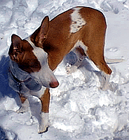 | Here is Madja eating her first chicken leg. She is fed B.A.R.F. (Bones And Raw Foods). |